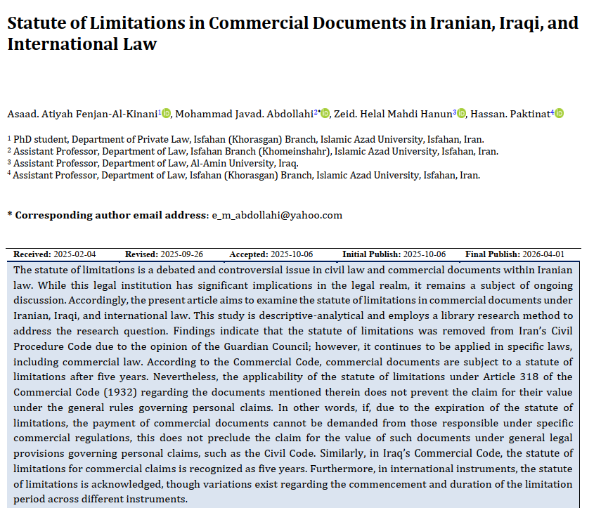 Atiyah Fenjan-Al-Kinani, A. ., Abdollahi, M., Helal Mahdi Hanun, Z., & Paktinat, H. . (2026). Statute of Limitations in Commercial Documents in Iranian, Iraqi, and International Law. Interdisciplinary Studies in Society, Law, and Politics, 1-11. http://193.36.85.187:8089/index.php/isslp/article/view/226