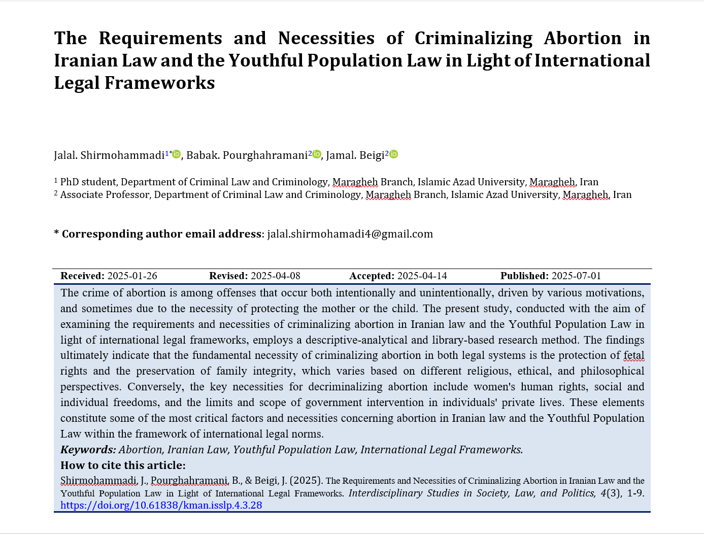 The Requirements and Necessities of Criminalizing Abortion in Iranian Law and the Youthful Population Law in Light of International Legal Frameworks