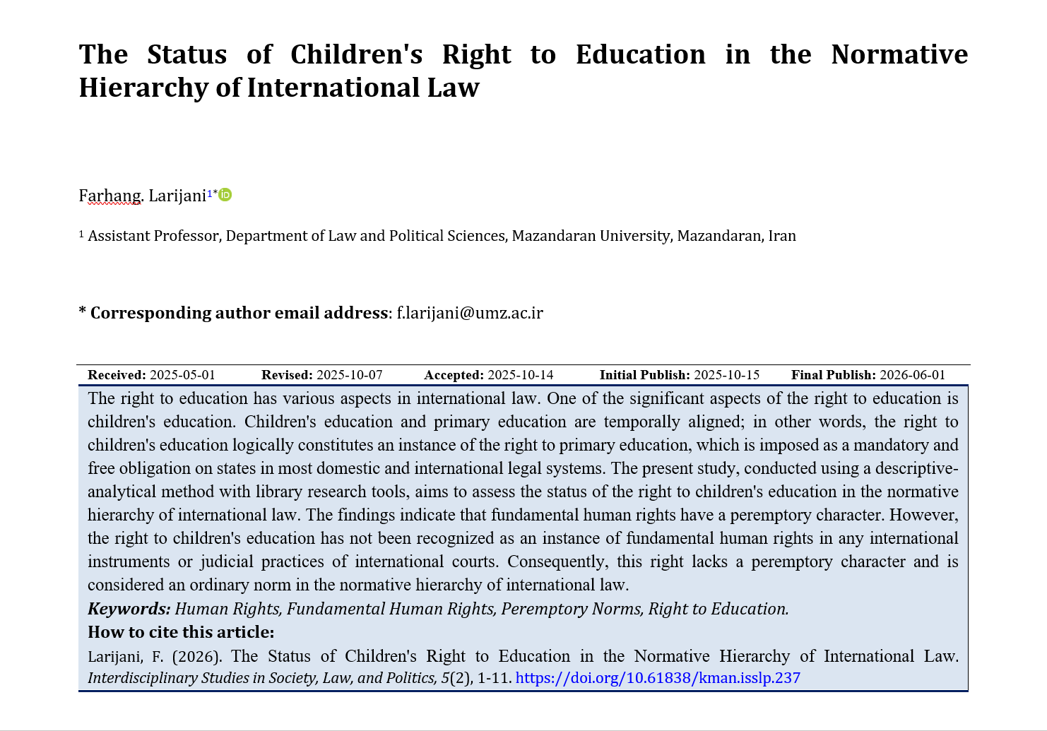 Larijani, farhang. (2026). The Status of Children’s Right to Education in the Normative Hierarchy of International Law. Interdisciplinary Studies in Society, Law, and Politics, 1-11. http://193.36.85.187:8089/index.php/isslp/article/view/237
