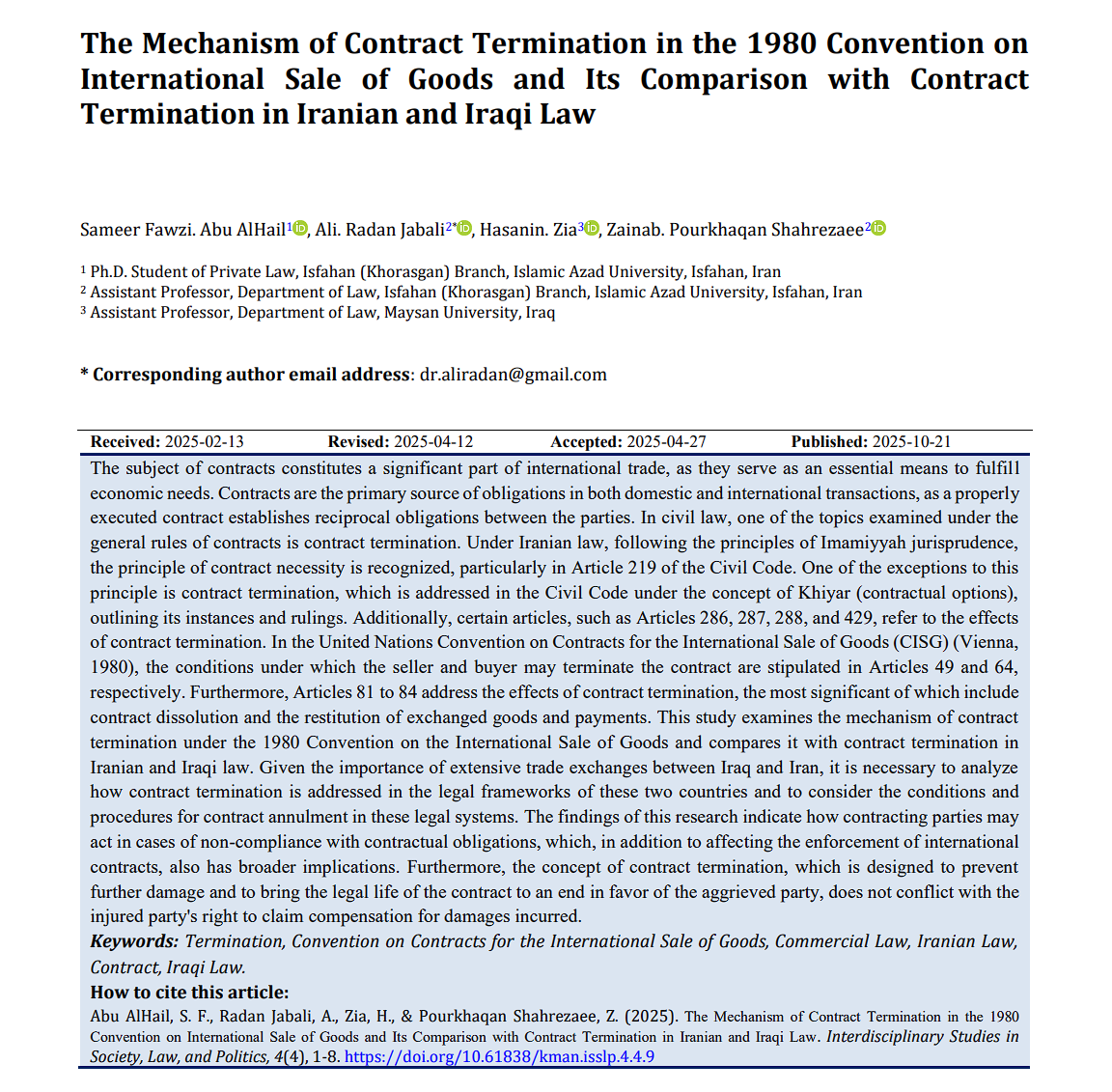 The subject of contracts constitutes a significant part of international trade, as they serve as an essential means to fulfill economic needs. Contracts are the primary source of obligations in both domestic and international transactions, as a properly executed contract establishes reciprocal obligations between the parties. In civil law, one of the topics examined under the general rules of contracts is contract termination. Under Iranian law, following the principles of Imamiyyah jurisprudence, the principle of contract necessity is recognized, particularly in Article 219 of the Civil Code. One of the exceptions to this principle is contract termination, which is addressed in the Civil Code under the concept of Khiyar (contractual options), outlining its instances and rulings. Additionally, certain articles, such as Articles 286, 287, 288, and 429, refer to the effects of contract termination. In the United Nations Convention on Contracts for the International Sale of Goods (CISG) (Vienna, 1980), the conditions under which the seller and buyer may terminate the contract are stipulated in Articles 49 and 64, respectively. Furthermore, Articles 81 to 84 address the effects of contract termination, the most significant of which include contract dissolution and the restitution of exchanged goods and payments. This study examines the mechanism of contract termination under the 1980 Convention on the International Sale of Goods and compares it with contract termination in Iranian and Iraqi law. Given the importance of extensive trade exchanges between Iraq and Iran, it is necessary to analyze how contract termination is addressed in the legal frameworks of these two countries and to consider the conditions and procedures for contract annulment in these legal systems. The findings of this research indicate how contracting parties may act in cases of non-compliance with contractual obligations, which, in addition to affecting the enforcement of international contracts, also has broader implications. Furthermore, the concept of contract termination, which is designed to prevent further damage and to bring the legal life of the contract to an end in favor of the aggrieved party, does not conflict with the injured party's right to claim compensation for damages incurred.
