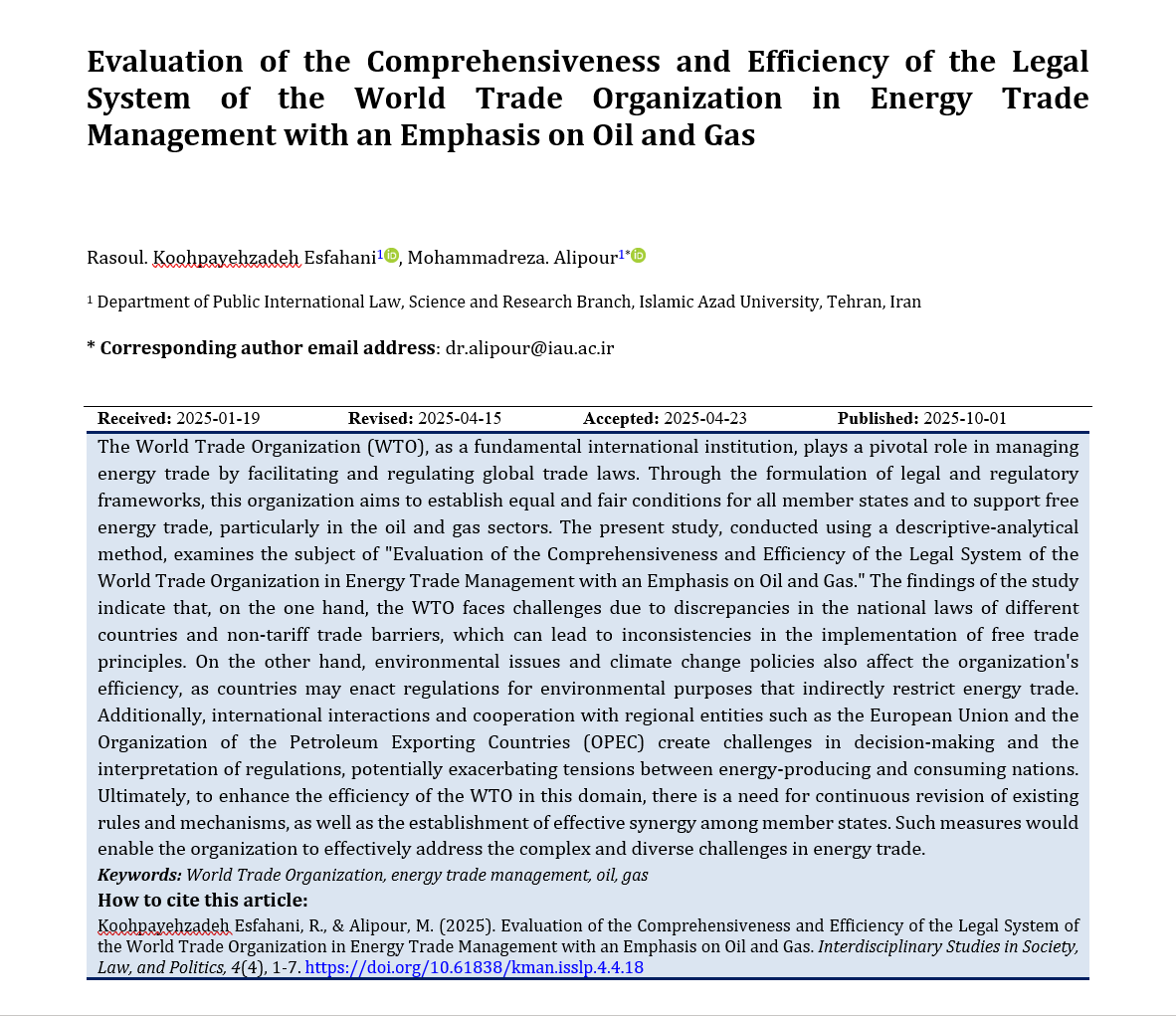 Koohpayehzadeh Esfahani, R., & Alipour, M. (2025). Evaluation of the Comprehensiveness and Efficiency of the Legal System of the World Trade Organization in Energy Trade Management with an Emphasis on Oil and Gas. Interdisciplinary Studies in Society, Law, and Politics, 1-7. http://193.36.85.187:8089/index.php/isslp/article/view/274