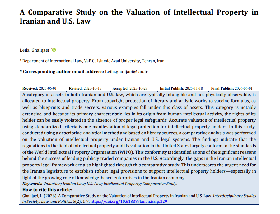 Ghalijaei, L. (2026). A Comparative Study on the Valuation of Intellectual Property in Iranian and U.S. Law. Interdisciplinary Studies in Society, Law, and Politics, 1-7. https://doi.org/10.61838/kman.isslp.329