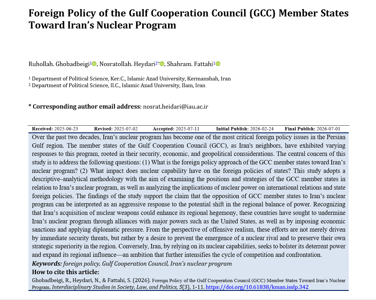 Over the past two decades, Iran’s nuclear program has become one of the most critical foreign policy issues in the Persian Gulf region. The member states of the Gulf Cooperation Council (GCC), as Iran's neighbors, have exhibited varying responses to this program, rooted in their security, economic, and geopolitical considerations. The central concern of this study is to address the following questions: (1) What is the foreign policy approach of the GCC member states toward Iran’s nuclear program? (2) What impact does nuclear capability have on the foreign policies of states? This study adopts a descriptive–analytical methodology with the aim of examining the positions and strategies of the GCC member states in relation to Iran’s nuclear program, as well as analyzing the implications of nuclear power on international relations and state foreign policies. The findings of the study support the claim that the opposition of GCC member states to Iran’s nuclear program can be interpreted as an aggressive response to the potential shift in the regional balance of power. Recognizing that Iran’s acquisition of nuclear weapons could enhance its regional hegemony, these countries have sought to undermine Iran’s nuclear program through alliances with major powers such as the United States, as well as by imposing economic sanctions and applying diplomatic pressure. From the perspective of offensive realism, these efforts are not merely driven by immediate security threats, but rather by a desire to prevent the emergence of a nuclear rival and to preserve their own strategic superiority in the region. Conversely, Iran, by relying on its nuclear capabilities, seeks to bolster its deterrent power and expand its regional influence—an ambition that further intensifies the cycle of competition and confrontation.