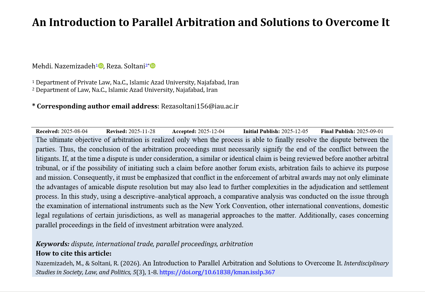 Nazemizadeh, M. ., & Soltani, R. (2026). An Introduction to Parallel Arbitration and Solutions to Overcome It. Interdisciplinary Studies in Society, Law, and Politics, 1-8. http://193.36.85.187:8089/index.php/isslp/article/view/367