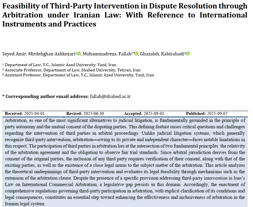 Arbitration, as one of the most significant alternatives to judicial litigation, is fundamentally grounded in the principle of party autonomy and the mutual consent of the disputing parties. This defining feature raises critical questions and challenges regarding the intervention of third parties in arbitral proceedings. Unlike judicial litigation systems, which generally recognize third-party intervention, arbitration—owing to its private and independent character—faces notable limitations in this respect. The participation of third parties in arbitration lies at the intersection of two fundamental principles: the relativity of the arbitration agreement and the obligation to observe fair trial standards. Since arbitral jurisdiction derives from the consent of the original parties, the inclusion of any third party requires verification of their consent, along with that of the existing parties, as well as the existence of a close legal nexus to the subject matter of the arbitration. This article analyzes the theoretical underpinnings of third-party intervention and evaluates its legal feasibility through mechanisms such as the extension of the arbitration clause. Despite the presence of a specific provision addressing third-party intervention in Iran’s Law on International Commercial Arbitration, a legislative gap persists in this domain. Accordingly, the enactment of comprehensive regulations governing third-party participation in arbitration, with explicit clarification of its conditions and legal consequences, constitutes an essential step toward enhancing the effectiveness and inclusiveness of arbitration in the Iranian legal system.