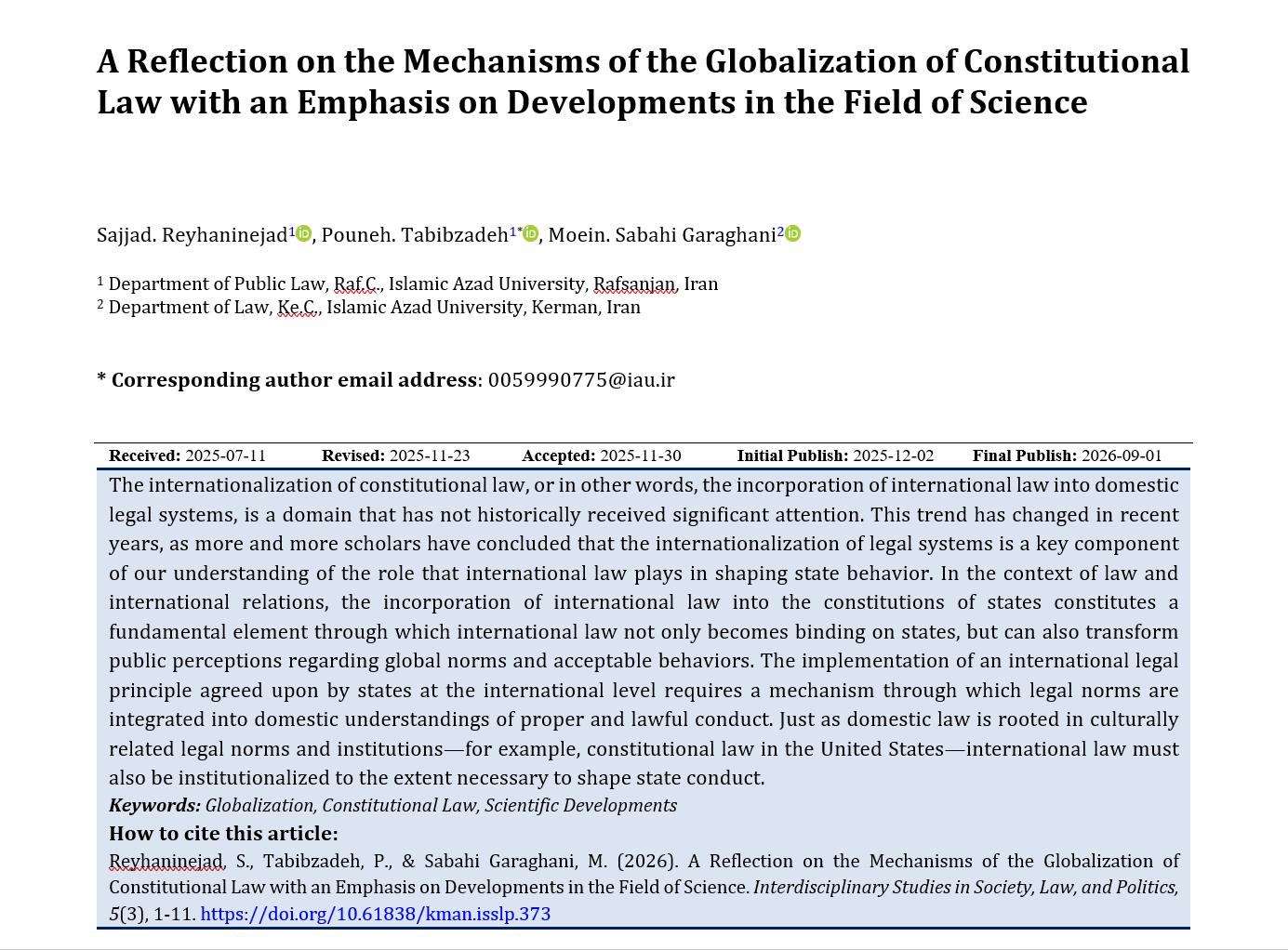 Reyhaninejad, S. ., Tabibzadeh, P., & Sabahi Garaghani, M. . (2026). A Reflection on the Mechanisms of the Globalization of Constitutional Law with an Emphasis on Developments in the Field of Science. Interdisciplinary Studies in Society, Law, and Politics, 1-11. http://193.36.85.187:8089/index.php/isslp/article/view/373