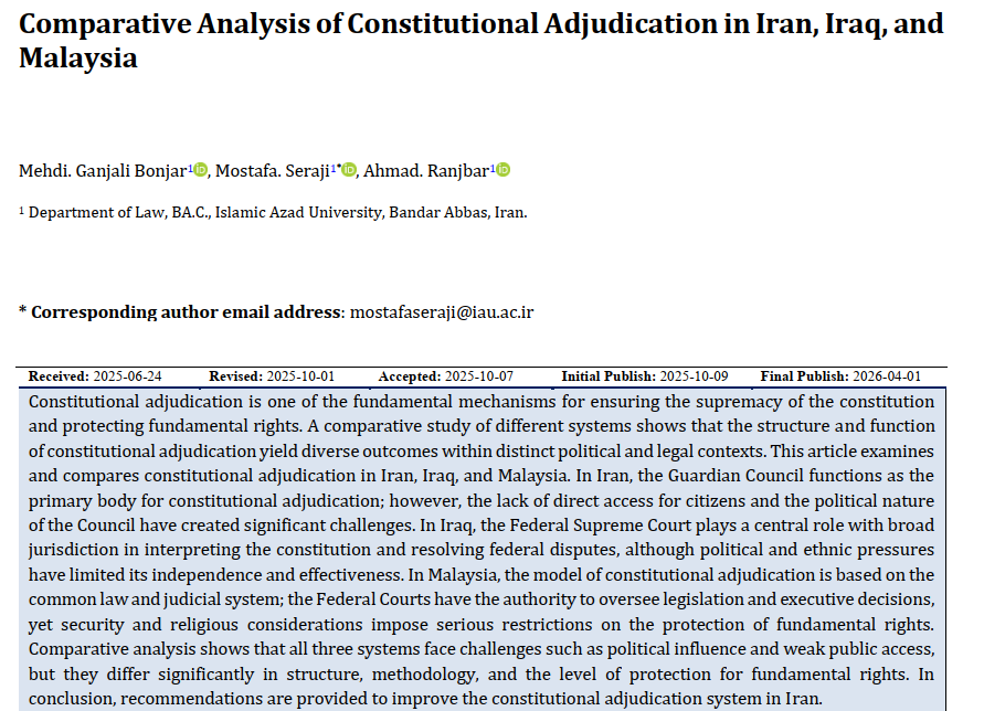 Ganjali Bonjar, M. ., Seraji, M., & Ranjbar, A. . (2026). Comparative Analysis of Constitutional Adjudication in Iran, Iraq, and Malaysia. Interdisciplinary Studies in Society, Law, and Politics, 1-12. http://193.36.85.187:8089/index.php/isslp/article/view/387