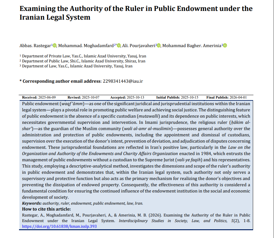 Rastegar, A. ., Moghadamfard, M., Pourjavaheri, A. . ., & Amerinia, M. B. . (2026). Examining the Authority of the Ruler in Public Endowment under the Iranian Legal System. Interdisciplinary Studies in Society, Law, and Politics. https://doi.org/10.61838/kman.isslp.393