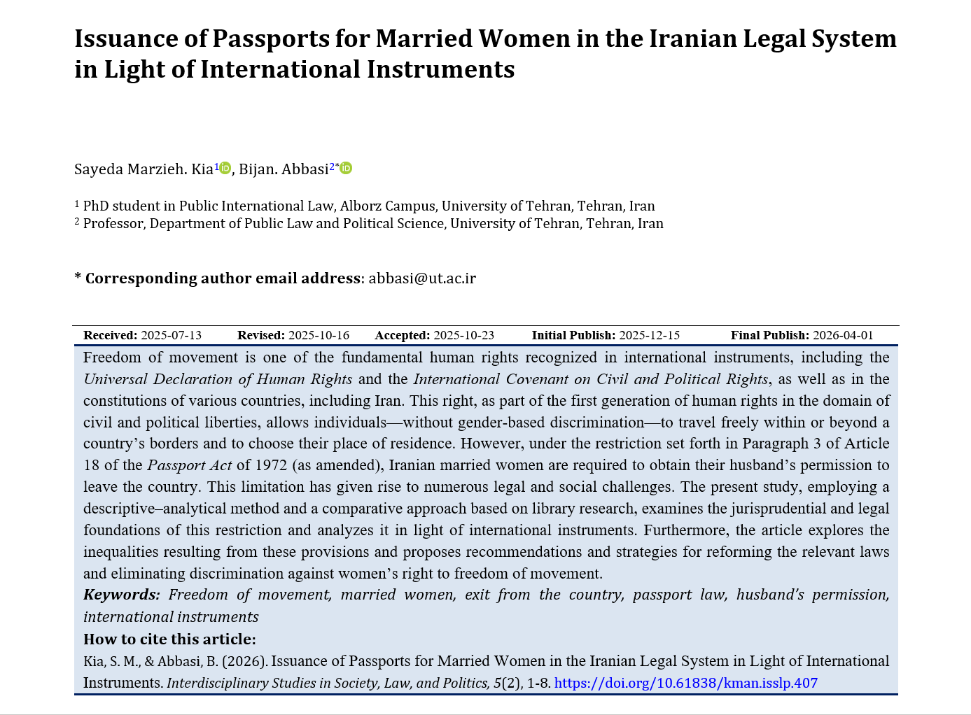 Kia, S. M. ., & Abbasi, B. (2026). Issuance of Passports for Married Women in the Iranian Legal System in Light of International Instruments. Interdisciplinary Studies in Society, Law, and Politics, 1-8. http://193.36.85.187:8089/index.php/isslp/article/view/407