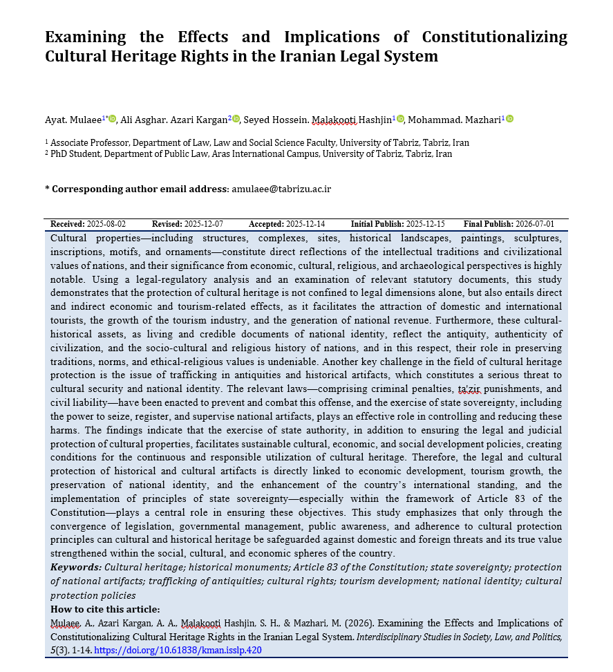 Mulaee, A., Azari Kargan, A. A. ., Malakooti Hashjin, S. H. ., & Mazhari, M. . (2026). Examining the Effects and Implications of Constitutionalizing Cultural Heritage Rights in the Iranian Legal System. Interdisciplinary Studies in Society, Law, and Politics, 1-14. http://193.36.85.187:8089/index.php/isslp/article/view/420